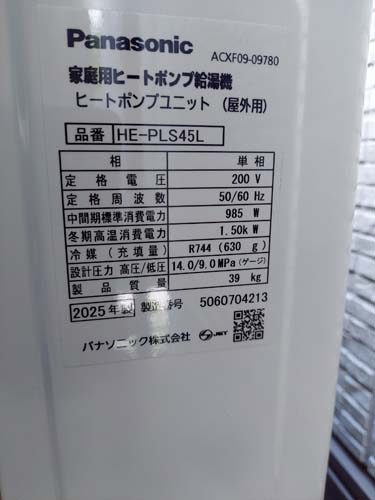 砺波市中央町 パナソニック家庭用ヒートポンプ給湯機 ヒートポンプユニットHE-PLS45L エコキュート交換工事