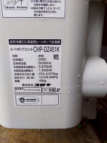 魚津市釈迦堂 コロナ自然冷媒CO2家庭用ヒートポンプ給湯機 ヒートポンプユニットCHP-DZ451K エコキュート交換工事